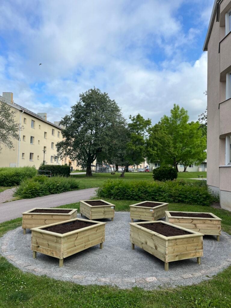 Vi vill skapa bostadsområden där människor trivs och möts. Under 2025 har vi placerat ut odlingslådor på några bostadsgårdar, med flera lådor samlade på samma plats. Det ger våra hyresgäster möjlighet att odla egna grönsaker, kryddor eller blommor – och samtidigt träffa grannar och skapa gemenskap.